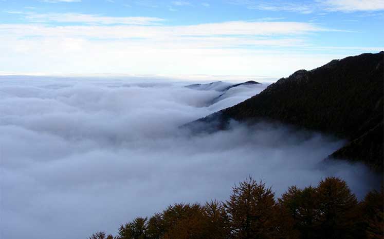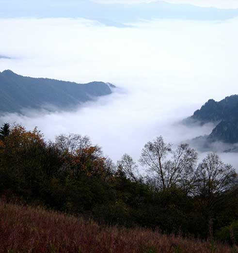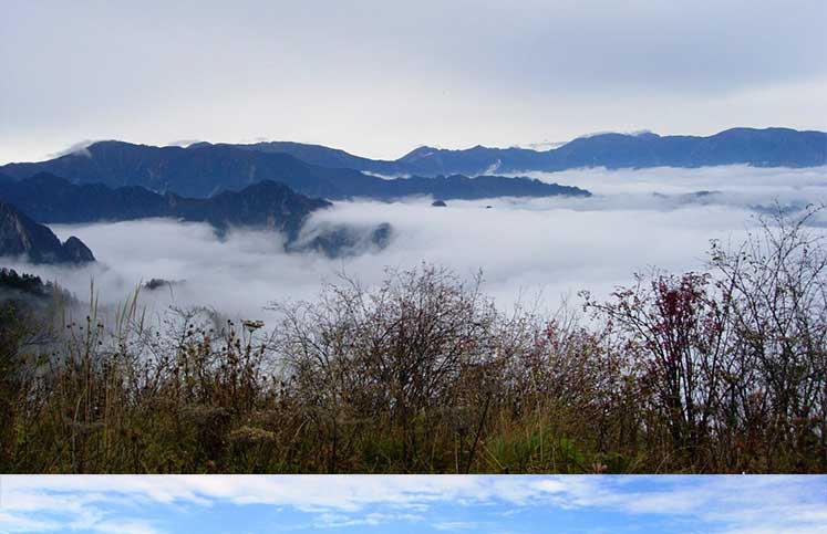 太白山横卧在宝鸡眉县、太白和西安周至3县境内。因山顶终年积雪,银光四射,故称太白。它是横贯陕西省的秦岭山脉的主峰,海拔3767米,也是秦岭的最高峰。 太白山以森林景观为主体,苍山奇峰、清溪碧潭、文物古迹点缀其间,层层山峰高耸入云,潺潺溪流之间怪石嶙峋,构成了一幅生动画卷。太白山以其高、寒、险、奇、秀和神秘的特点闻名于世,即使在盛夏时节山顶也终年积雪。“太白积雪六月天”是著名的关中八景之一。 太白山内,从北坡到南坡,可概括为“红河丹崖、斜峪雄关、古枫幽境、桃川曲流、斗母奇峰、平安云海、太白明珠、拔仙绝顶”八景,八景之中以“太白明珠”最为引人入胜,“明珠”实为大爷海、二爷海、三爷海等湖泊。湖水清澈、平静,犹如颗颗洁白明珠镶嵌于太白山间。湖水周边亦是雾锁山谷,转瞬间雾气弥散,人影不见,别具兴味。 自古太白山就为历代帝王重视,文人墨客的足迹更是遍布山山岭岭。李白、杜甫、柳宗元、苏轼等都曾游过此,留下大量赞美太白山景色的诗篇。“太白泼墨山”便传说为李白作诗之处;唐代著名医药学家“药王”孙思邈亦在此留有捣药的碓窝。